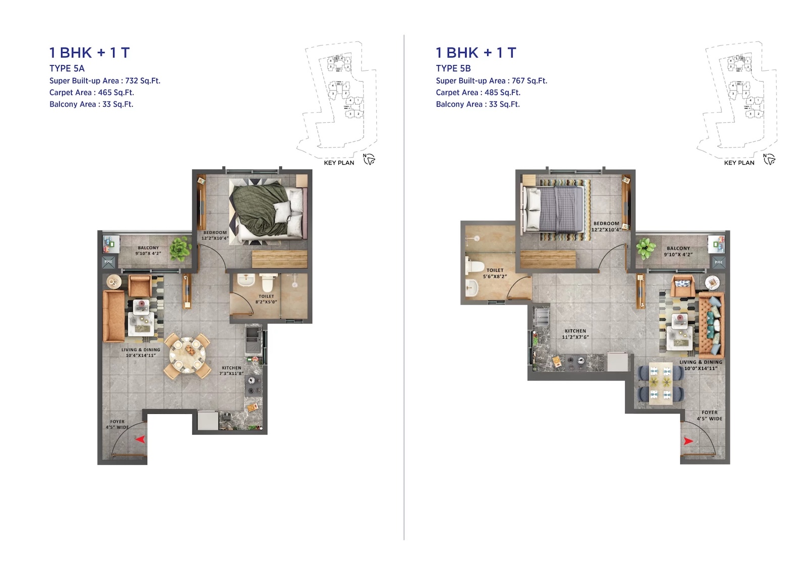 These cozy 1BHK apartments range from 732 to 767 Sqft, ideal for singles or small families.